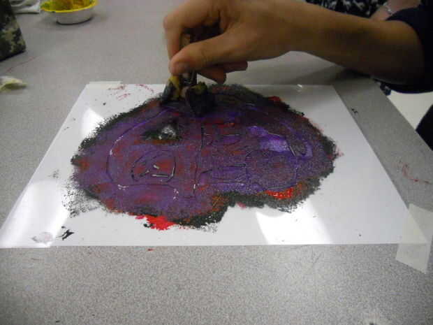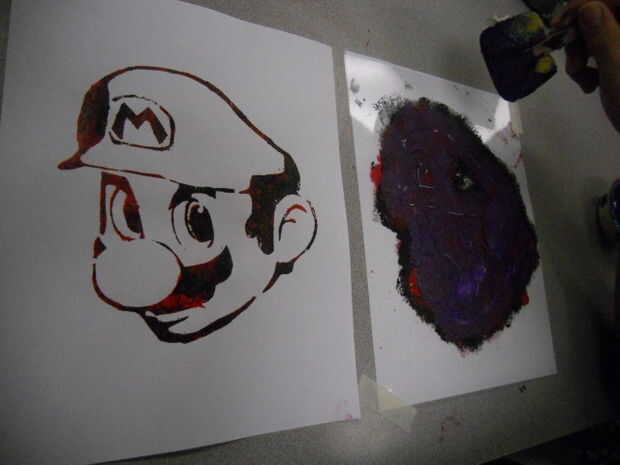 Utilizamos hacia arriba pintura acrílica y poco esponjas en pinzas para imprimir. La clave es ir lento, ve recto arriba y abajo (untarlo) y no tener un montón de pintura en la esponja. Demasiada pintura sangrará por debajo de su plantilla.