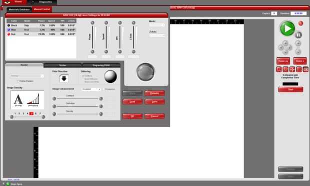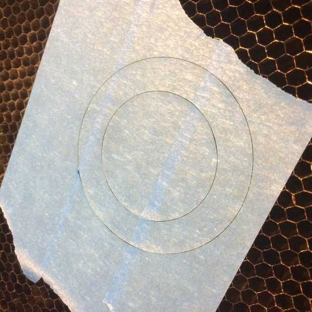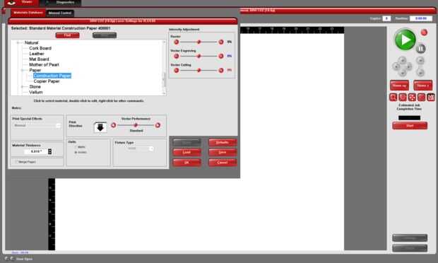 Localizar el contorno de la geometría para que el archivo en la cama, para ello se centra en la cinta. En la configuración, establezca el material en papel de construcción. Ajustar el espesor del material. 01". En la configuración manual, establezca el negro para saltar, haga clic en establecer y aplicar.