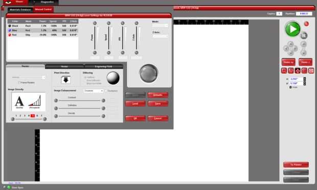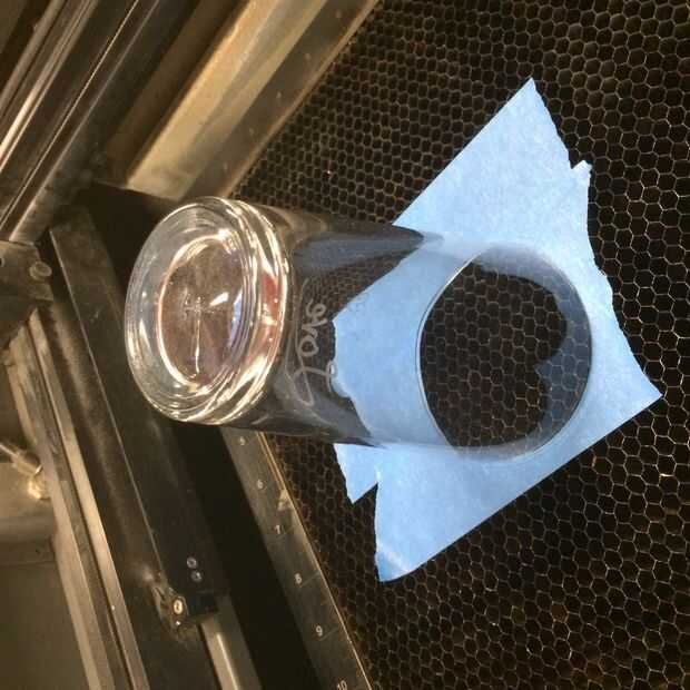 Vuelve a la configuración y elegir el material y el espesor del material que son apropiados para el elemento de que grabado. En este caso, se elegir vidrio borosilicato y el espesor del material será 5,875"(la altura del vidrio). En la configuración manual, seleccione negro y ponerlo a grabar, haga clic en establecer y aplicar. Seleccione la Red y configurarlo para saltar, haga clic en aplicar. Alinee el punto con el contorno en la cinta de pintor. Comenzar el grabado de archivo. Cuando ha terminado grabado, retire el elemento y repetir el grabado con otro elemento.