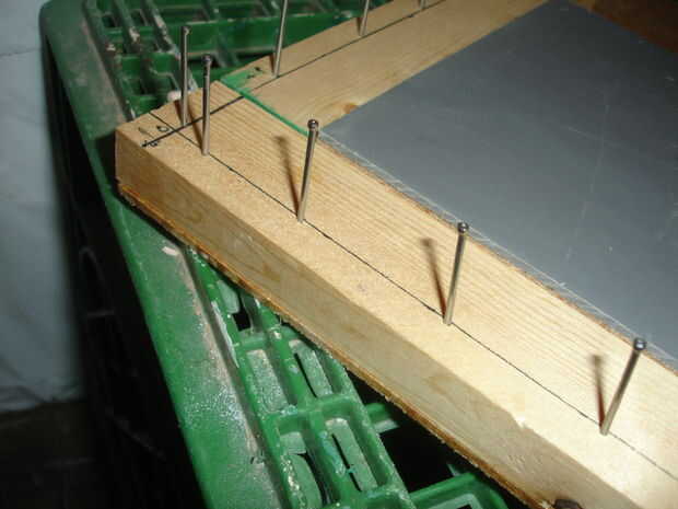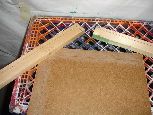 Me mide 1" en la parte plana de 1 x 2 (que es realmente una.75 x 1.5, recuerda) y lijada la superficie shinyish de la masonita. El masonite puede ser un poco demasiado resbaladizo, una vez que comience a imprimir, hacer del bloque un poco popular, pero puedo rayar o agregar una capa de pintura de aerosol de goma o algo más tarde.