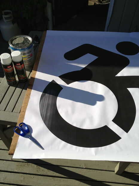 1 print-out, por lo menos 32 "x 32" en una impresora de "ingeniería"--$10. Tu tienda de copia local o cualquier distribuidor nacional (Kinkos, grapas, etc.) tienen las impresoras Ingeniero. Pedí un 36 "x 48" y salió perfecto! La imagen está para descargar aquí: http://www.accessibleicon.org/uploads/1/3/8/3/13834741/accessibility20icon_final.pdf