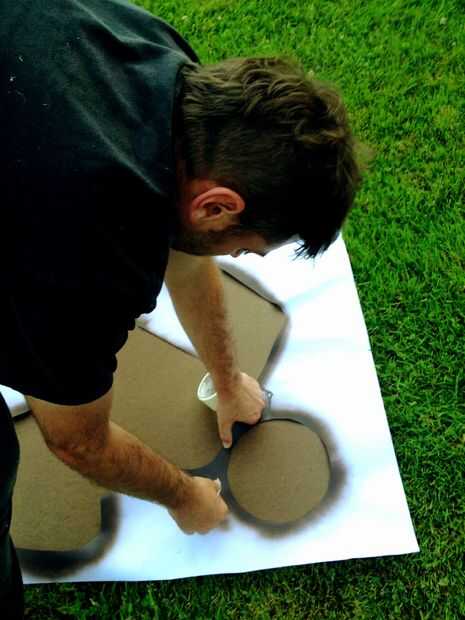 Centro de la plantilla de papel sobre la madera contrachapada/aglomerado en un área que puede manejar un exceso de rociado, como su césped. Cinta abajo algunas de las zonas más frágiles como la pintura de aerosol tiene una explosión bastante de gran alcance del aire. Luego, usando su spraypaint, rocíe los bordes de la figura sobre la madera con movimientos confiados y seguros, con el fin de su poder hacia abajo, inclinada levemente hacia la parte de madera del borde. El punto de esto es simplemente obtener un esquema de la figura como una guía para cortar el tablero con su juego.
