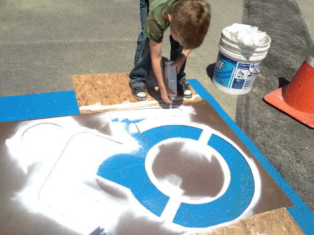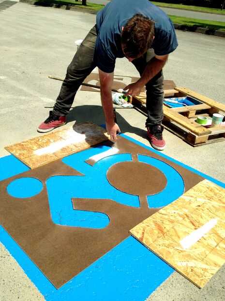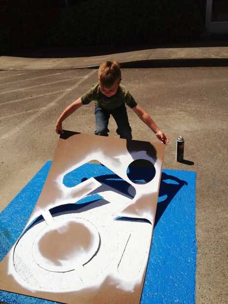 Primer centro de la plantilla en el fondo azul (ahora seco). A continuación, utilice tableros/cartón de desecho a lo largo de los bordes de overspray. Primero pintar las zonas de la plantilla que son sensibles; Tengo a menudo abajo de las axilas y piernas cielo al rociar los bordes. Entonces, golpear todos los bordes. Usted puede simplemente entregar la pintura a sus ayudantes para terminar el resto. Es divertido ver lo emocionado que reciben. La pintura se seca muy rápidamente, por lo que normalmente puede levantar la plantilla inmediatamente y ser testigo de la gloria!