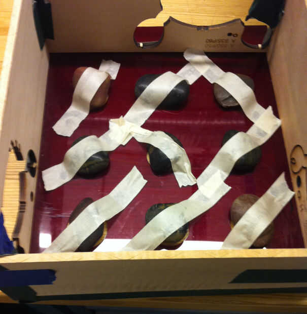Cargar su material en el interior de la caja con una cara plana decentemente hacia el acrílico. Con una plantilla más agradable puede que no necesite la cinta de enmascarar para mantenerlos temporalmente en el lugar, pero las rocas eran pesadas y le gustaba deslizarse alrededor antes de les aseguraron.