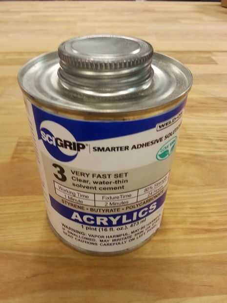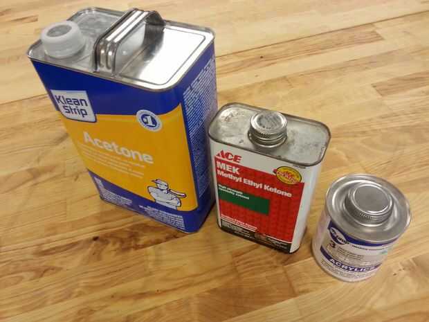 Adhesivo permanente acrílico es muy fácil si se utiliza un disolvente. Hay algunos comercios acrílico Adhesivo cementos pero se puede utilizar acetona normal. He utilizado acetona, MEK (metil etil cetona) y especialmente formulado solventes como el ilustrado. La principal ventaja de este último es que el tiempo de curado muy corto. El rendimiento del MEK es bastante similar a la acetona, tal vez un poco mejor.