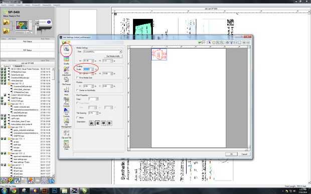 - Esta imagen en particular no corte bien si está demasiado pequeño (lo he comprobado y). Para aumentar el tamaño de la imagen en "Diseño" (un círculo rojo aquí) debajo de "Escalamiento" (un círculo rojo) cambiar la escala para que el robot es de 10 "x 10". Para mí, esto pasa a ser alrededor del 240%. Por otro lado, podría haber hice el robot 10 "x 10" en Illustrator. Ambos rescalings funcionará.