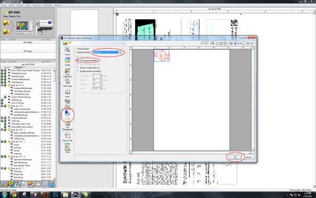 - Vaya a "Cortar los controles" (un círculo rojo) y en el menú desplegable modo de funcionamiento seleccione "corte solamente" y comprobar "imagen corte límites" (un círculo rojo). Continuación, seleccione "Ok" en la esquina derecha inferior del viento configuración de puestos de trabajo (un círculo rojo).