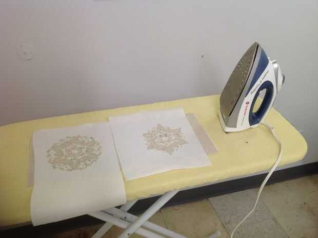 Planchar el papel sobre la tela con el * el lado brillante revés.* lo contrario, la plantilla no se adhieren a la tela, y, si no utiliza un paño de la prensa, su plantilla se fundirá en el hierro.
