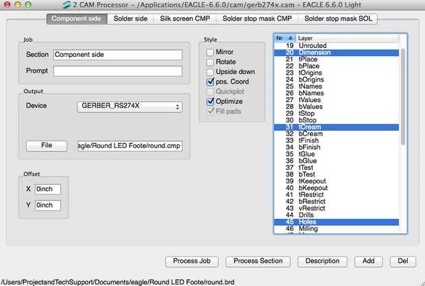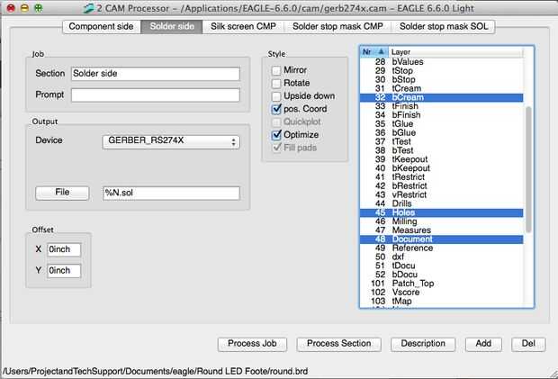 Tenga en cuenta que el costado del componente tiene el Gerber para la capa superior de la crema (tCream) y el lado de la soldadura tiene el Gerber para la capa de fondo crema (bCream). Si sólo estás haciendo una plantilla para un lado, introduce la información para el lado que está trabajando.
