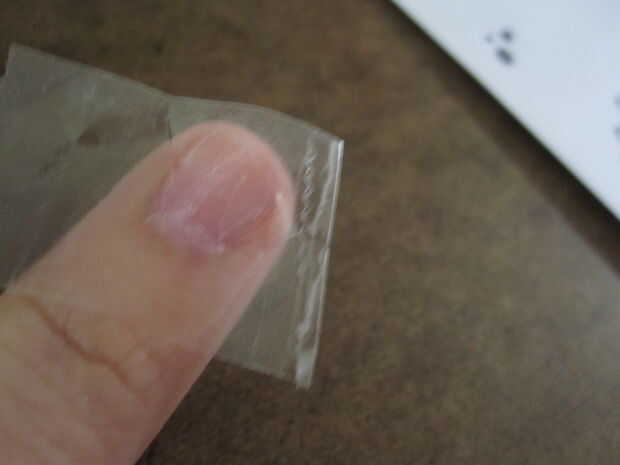 Tire de la cinta del protector de la hoja, esto puede ser difícil, pero no te preocupes demasiado. Tratar de impedir que rasga demasiado, pero un poco no hace daño. Al aplicar la cinta a su clavo, tratar de asegurar los lugares que deben estar tocando son. En otras palabras, asegúrese de que los bordes de la cinta arrancó cumplen con los bordes correspondientes.
