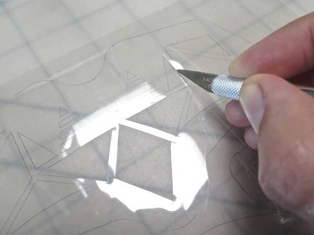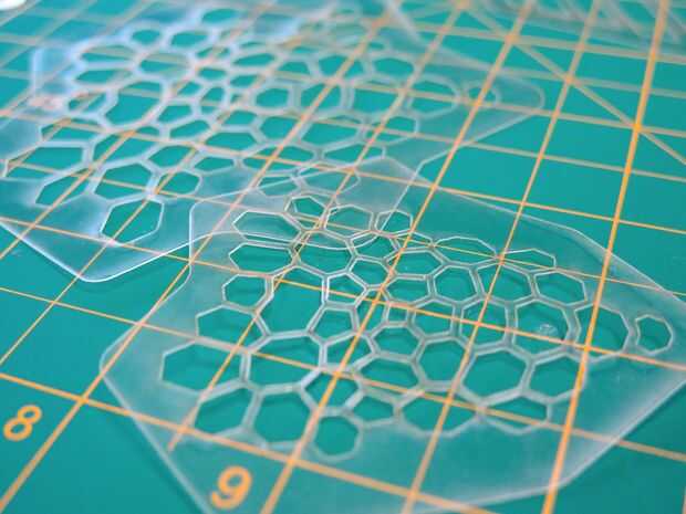Probé algunos de mis plantillas más simples hacia fuera de corte a mano y encontré funcionó bastante bien. Imprimí mis diseños derecha en acetato primero y luego usa un exacto sobre una estera de corte para cortar las. En algunos de los más pequeños rincones curvos que ayudó a agujeros antes de cortar.