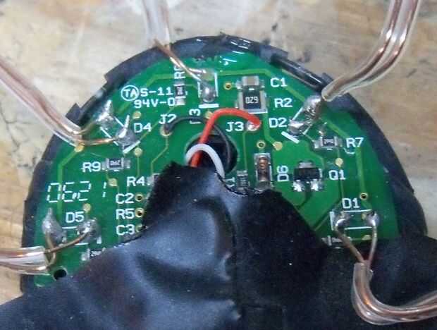 En primer lugar, grieta abierta el caso. En la parte frontal del tablero del circuito son los cinco LEDs de montaje de superficie, lo sentimos pero no hay foto de ellos en su lugar, se puede ver donde estaban las fotos aunque. Desoldar y quitar cada uno, asegurándose de mantener intacta las almohadillas cuando haces cuidadosamente. Una vez que se retiran, coloque una longitud corta (6-8 pulgadas) de cable de altavoz en cada plato.