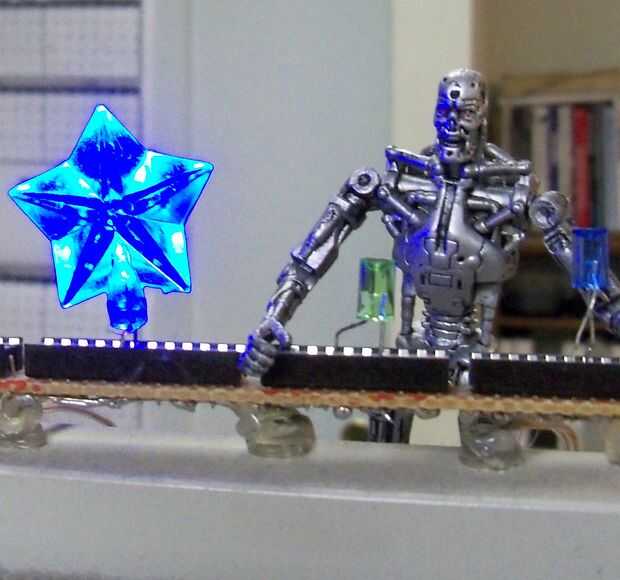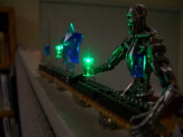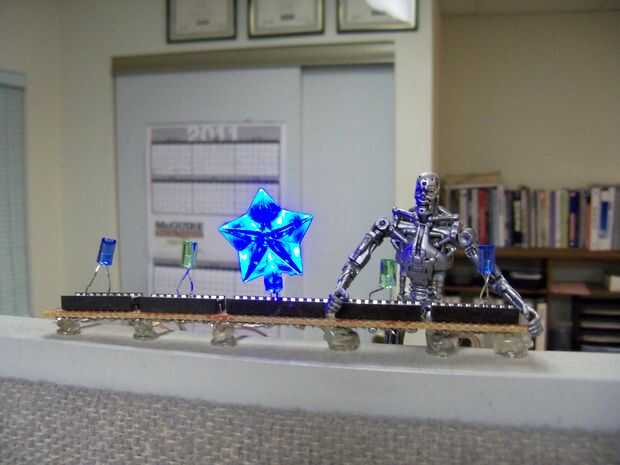 Pegar unos imanes en la parte inferior de la tira de perfboard por lo que puede sujetar a algo de metal (en mi caso, el borde superior del divisor me separa el frente de la oficina). Todo hecho! En este momento pasé un montón de tiempo recogida de LEDs a utilizar en este dispositivo, de mi ya amplia colección, de electrónica antigua y de luces de Navidad LED.