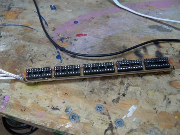 En una tira de perfboard, fije cinco zócalos IC. Soldar todas las patas a cada lado de cada conexión entre sí. Conecte un cable a cada toma, el extremo positivo de un lado y los negativos por otro. Ahora podrás colocar un LED en cada toma, la pata negativa en un lado y el positivo en el otro.