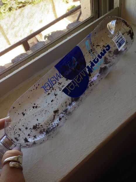 Una vez que todos los suministros, toma el cortador de la caja y cortar un óvalo de un lado de la botella.