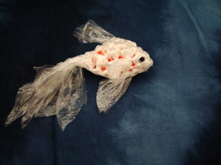 he usado esas bolsas de plástico translúcidas finas de la sección de productos en la tienda de comestibles, en parte porque no conseguimos gratis bolsas plásticas aquí en Toronto y las bolsas de plástico sólo que tengo en la mano son que aquellos producen. pero también porque creo que la calidad de las bolsas de productos translúcida y delicada haría un bonito pez.