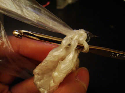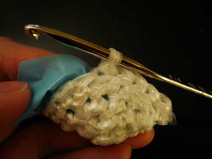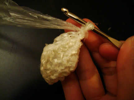 Cuando a mitad de camino, cosas con pedacitos de un plástico del bolso, luego continuar crochet bordes juntos. Deja una cola de 2 pulgadas y fije apagado.