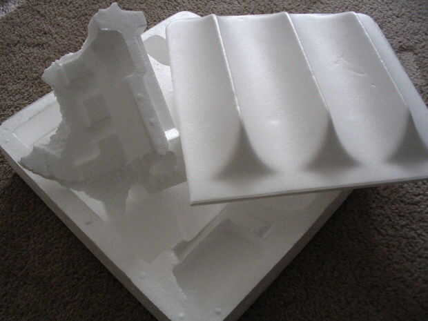 Tomar la espuma de poliestireno (utilizar envases de una impresora y separadores para botellas) y romper en trozos más pequeños (de 3 "x 3"x2"o unos 80 x 80 x 50 mm) el tamaño no importa, pero que hace más fácil derretir.