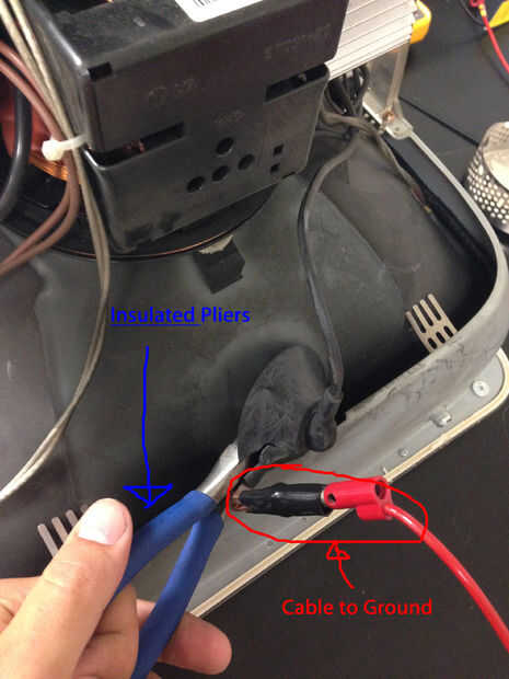 A continuación, construir un dispositivo de descarga a tierra. Usé un par aislado de pinzas conectado al pin de tierra en mi alimentación. Simplemente los alicates de la cuña en el puerto de cátodo del CRT y esperar un par de segundos para el flotantes 50.000 voltios a descarga a tierra.