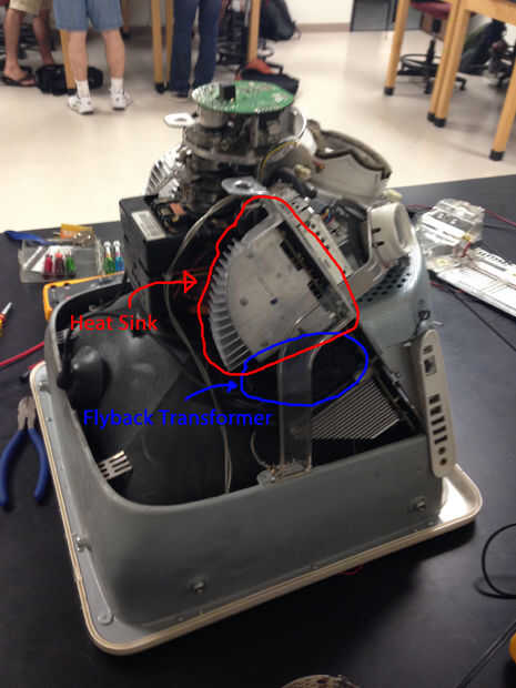 Sólo necesitamos dos componentes de un CRT: el transformador flyback para amplificar nuestra señal a voltajes ridículo y un par de disipadores de calor para evitar que dichas tensiones destruyendo nuestro MOSFET. Los disipadores de calor deben ser evidentes una vez que quite la carcasa de la CRT y probablemente alrededor de puertos de ventilación. Recuerde también marcha a lo largo de cualquier condensadores de descarga antes de tocarlas! Sólo tiene que conectar los puertos con un destornillador y debe ser, o siga las instrucciones en este enlace conveniente: http://www.wikihow.com/Discharge-a-Capacitor.