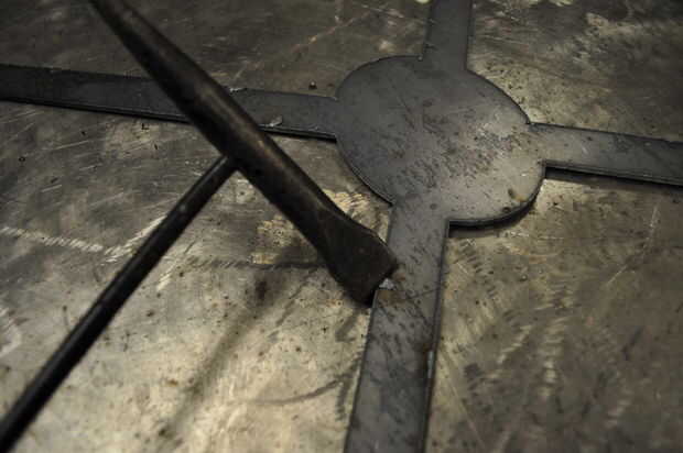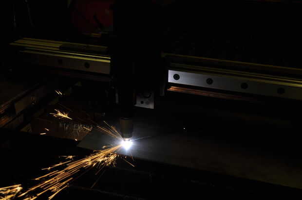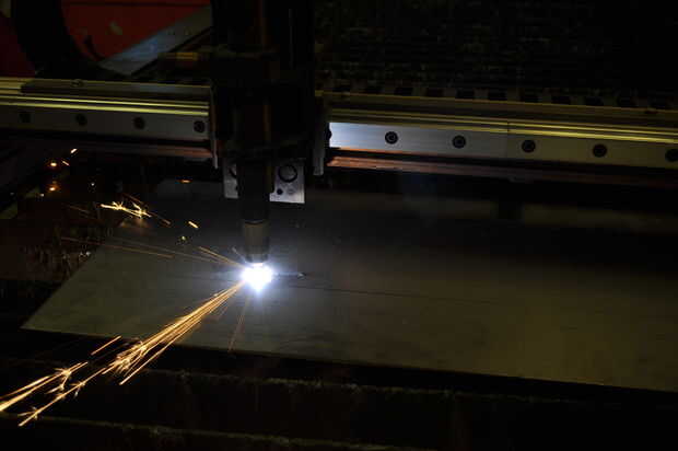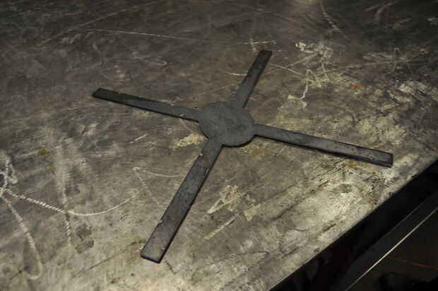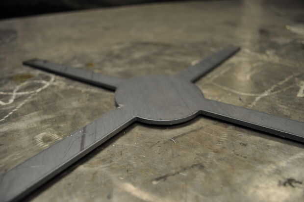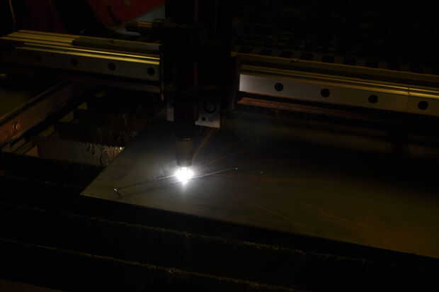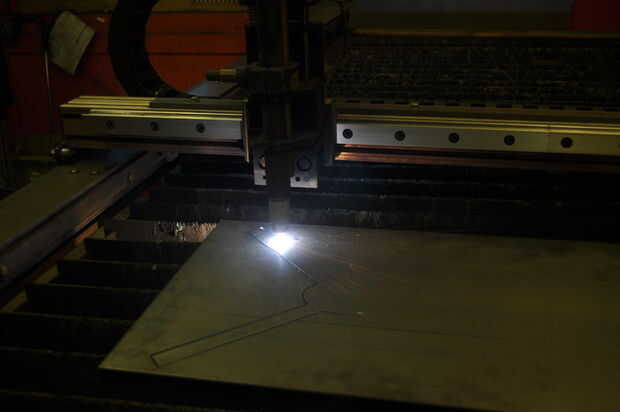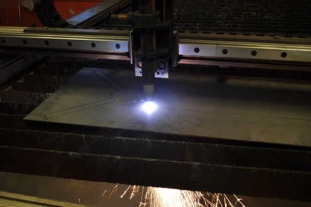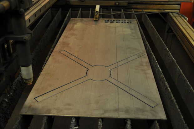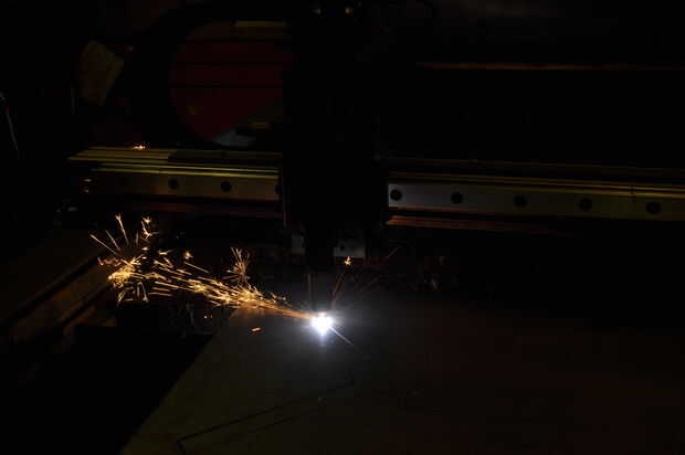 Carga de la placa de acero en el cortador del plasma. Para placa de 1/8 de pulgada, establece el cortador de plasma de 40 amperios y ejecuta a cerca de 65 pulgadas por minuto. Una vez terminado, quite los lazos con un par de pinzas (que estará muy calientes) y retire cualquier acumulación de escoria en la parte posterior con un martillo. Una amoladora con un disco de la aleta también puede ser utilizada para este propósito así como añadir un acabado al acero.