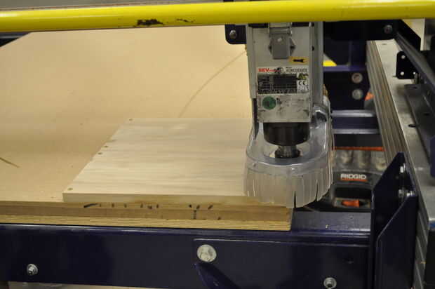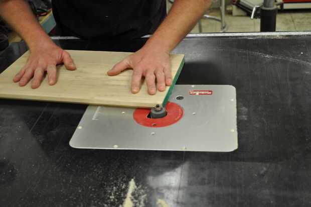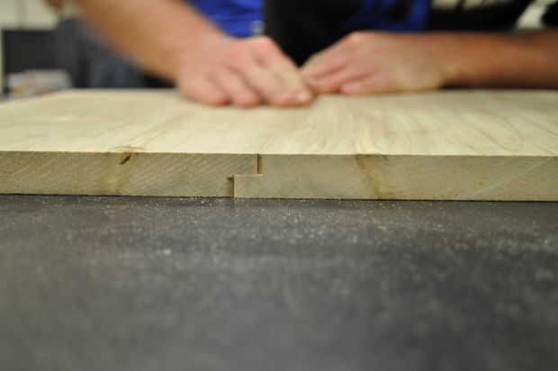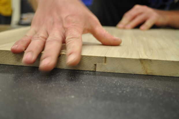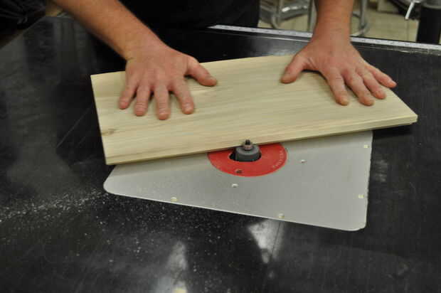 Fijar las tablas a la mesa de la máquina de la C.N.C. fresadora madera con tornillos, asegurándose de que la articulación de la barbilla se tiró firmemente. Si utiliza este método, se recomienda que las juntas se cortan más ancha que las dimensiones finales para que los orificios pueden eliminarse en la mesa de sierra cuando dimensionamiento final ocurre. Cortar el embutido y quite cualquier rasgón hacia fuera con papel de lija de grano 150.