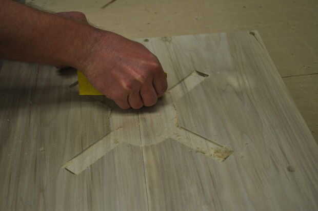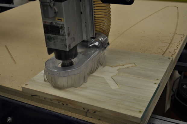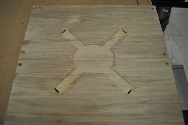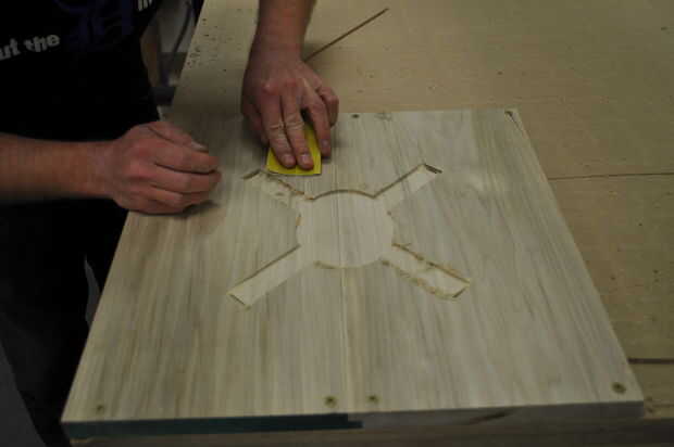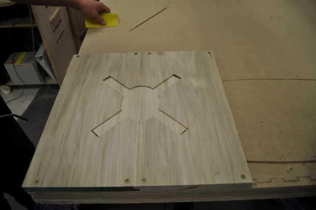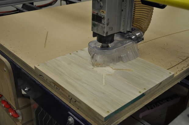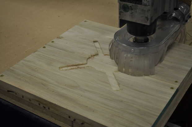 La incrustación se puede cortar a mano, pero de TechShop Menlo Park C.N.C. ShopBot fresadora madera fue utilizada para mantener exactitud. El embutido debe cortarse a poco más de las dimensiones de la corbata. Si el vínculo fue cortado usando el cortador de plasma C.N.C., el mismo archivo puede utilizarse para ambas máquinas, como el corte del plasma permite el empate ser incluido. Se cortan las ranuras donde se doblará el acero a través de la madera más anchos que el grosor del metal (aproximadamente de 0,010 pulgadas más ancho).