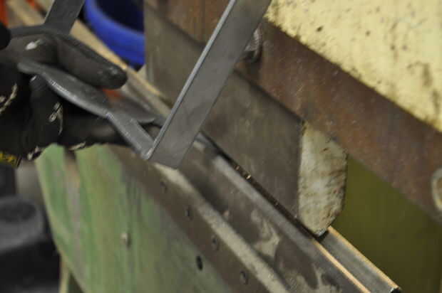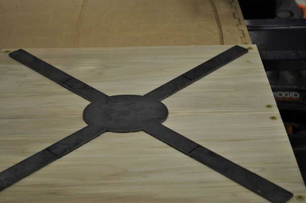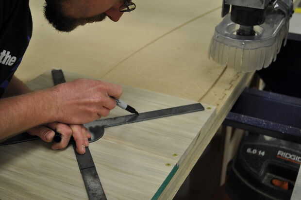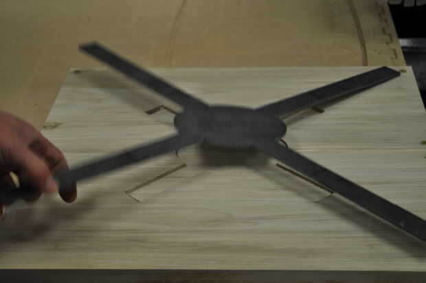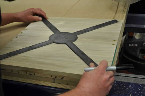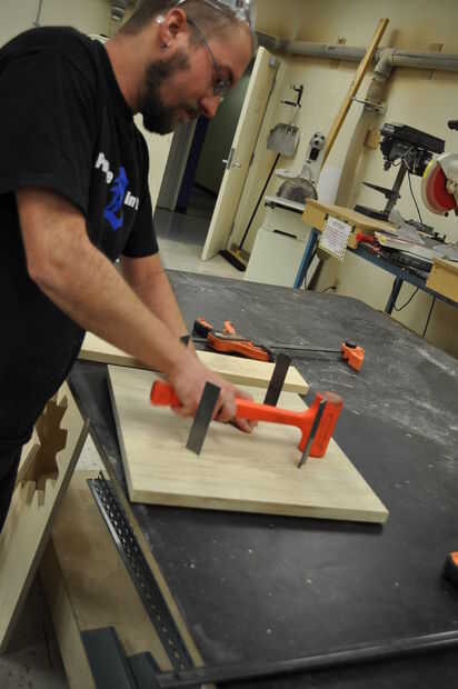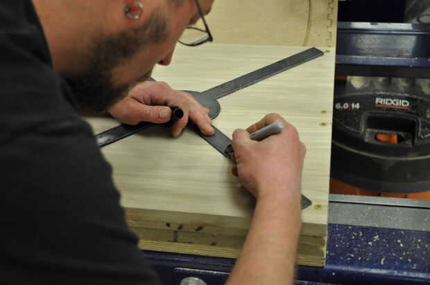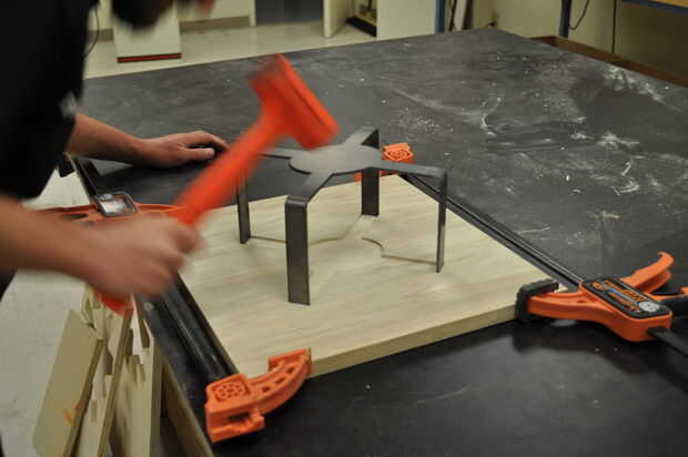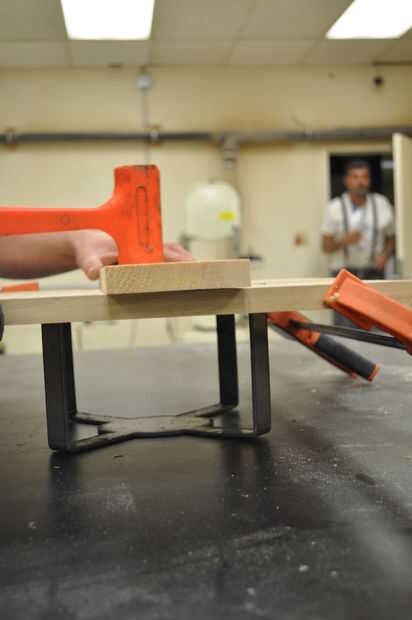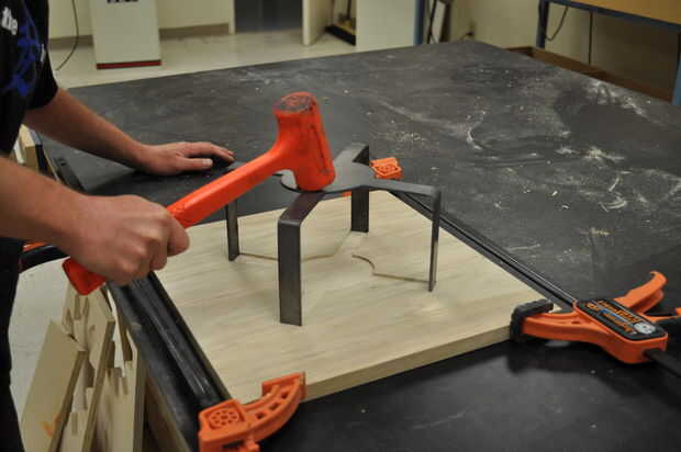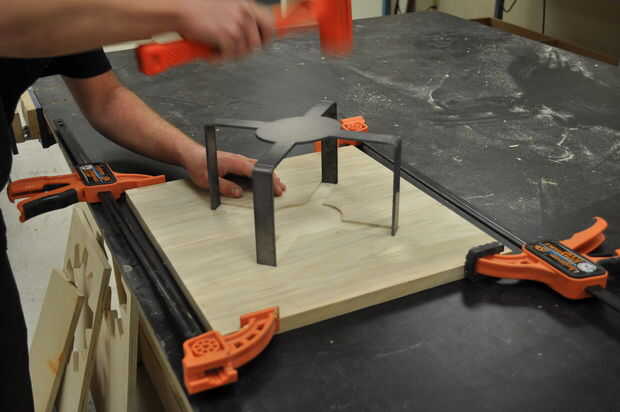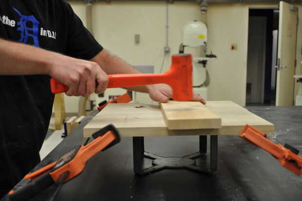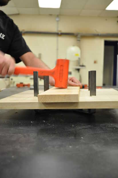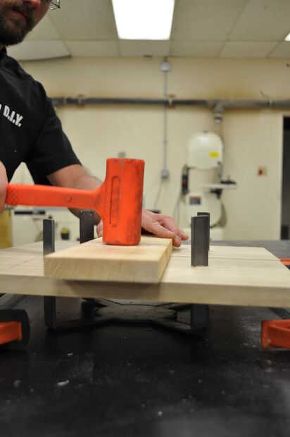 Coloque las tarjetas en una superficie plana y ligeramente la abrazadera juntos para evitar que la articulación se propague. Utilice un mazo de hueco para golpear las curvas en las ranuras cortadas en la madera. Voltee la Asamblea y, colocando una tabla de desecho sobre la articulación, martillo de los tableros en el empate. Asegúrese de martillo uniformemente a través de la costura para evitar que la madera de la división.