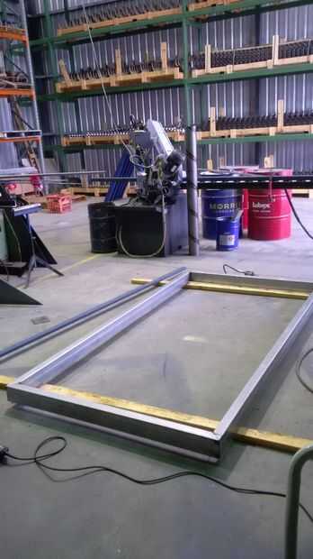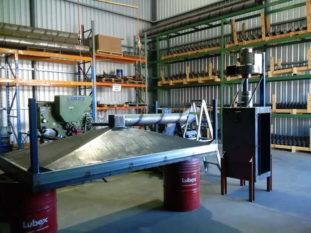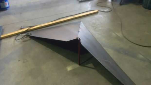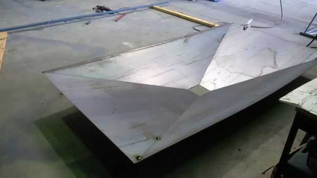 Tachuela y la hoja de corte de acero de 1,6 mm de plasma soldadura juntos, luego a la estructura. Dos hojas de hojas de 1220 x 2400 m m se necesitan para esta tolva y algunos de los recortes se utilizan más adelante. Reunir los cuatro pedazos de la tolva fue incómodo y el método de utilizar un tubo sobrante para apoyar el centro trabajó lo mejor porque se puede ajustar el ángulo de la tubería de flexión donde se viró a la hoja a mover ligeramente la tolva hacia arriba o hacia abajo cuando se hace el montaje de soldadura de tachuela final de esta parte. A lo largo de esta etapa era imposible no pensar en drogas toscamente fabricados, México ejecuta submarinos :-)
