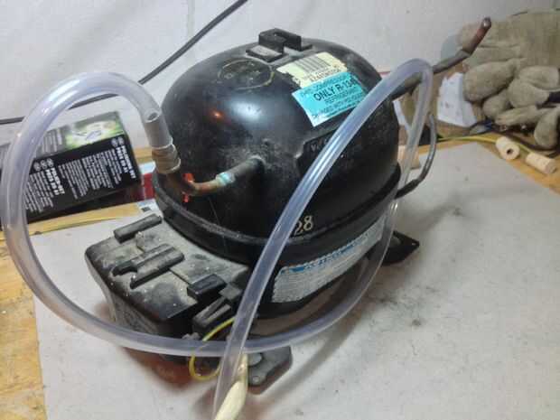 Bombas de vacío son caras, por eso estoy usando una vieja forma de compresor frigorífico. Até a una gruesa tubería de pvc para el extremo de la succión. Funciona realmente bien.