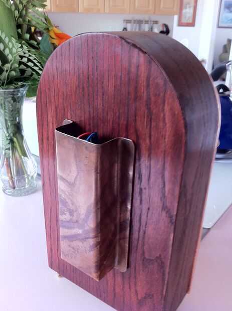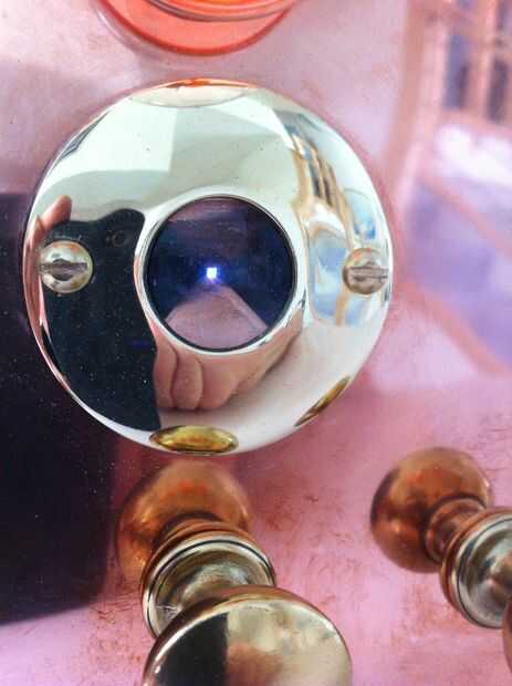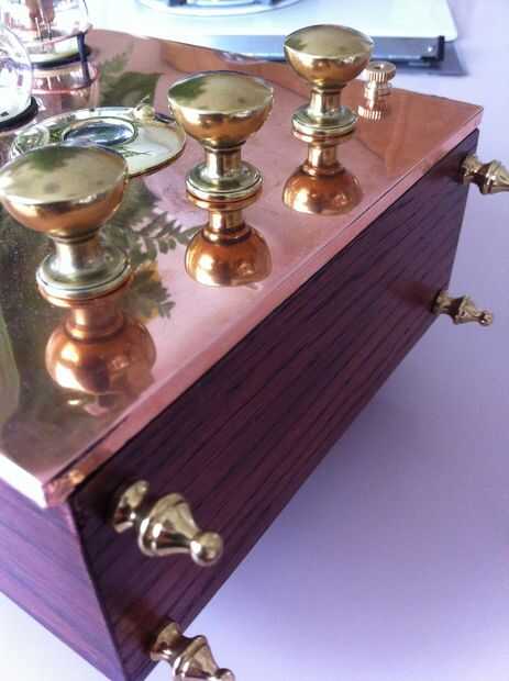 El anillo de cobre amarillo del centro tiene una lupa que muestra el arco de acción, se hizo de un sostenedor de vela de taladrar y una lente binocular.