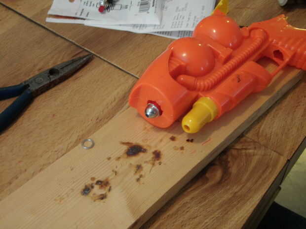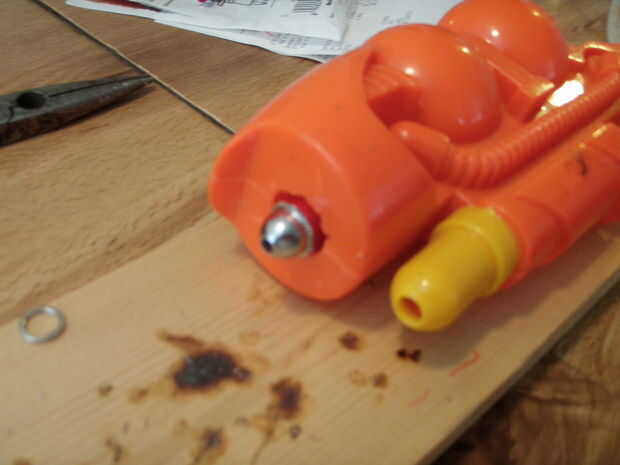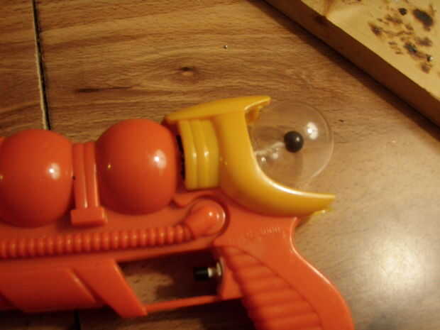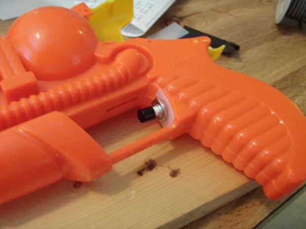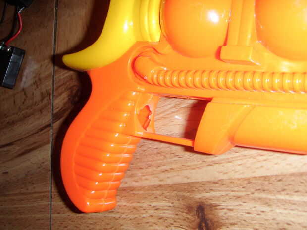 Corte la parte trasera de la pistola de agua con una herramienta giratoria. A través de este agujero destruyó el arma, retirar el gatillo, la bomba y el tubo de plástico pequeño. También corte un agujero en el cañón de la pistola para el puntero láser y con el gatillo para el botón.