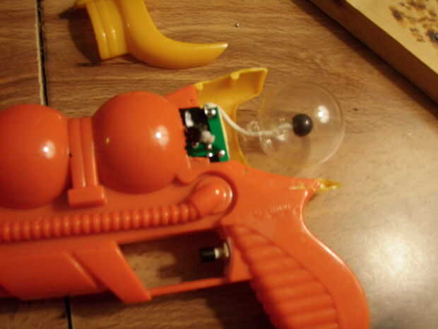 A continuación rellena en las entrañas de la bola de plasma y su batería. La bola de plasma quedaba pegado por la parte trasera, el interruptor se quedó pegado al lado y todo lo demás estaba escondido dentro del cuerpo de la pistola.