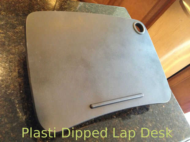 he comprado un eComfort Brookstone escritorio del regazo porque me gustó la forma, el tamaño y la robustez del diseño. No me gustó, sin embargo, el grano de madera del faux del acabado de la superficie de trabajo. Además de la falsa apariencia, la superficie es muy resbaladiza y mi portátil se desliza fácilmente alrededor en él. Después de ver algunas de las cosas que puedes hacer con Plasti Dip, decidí probarlo en mi escritorio.