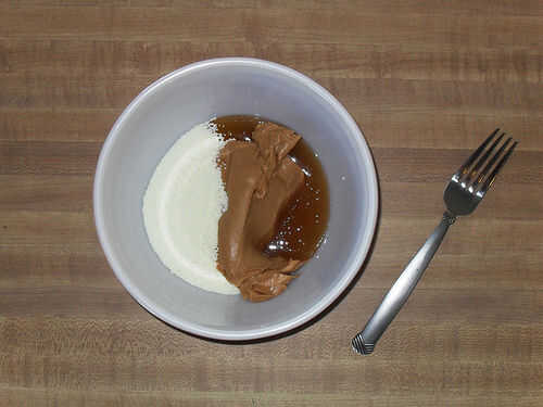 Medir y volcar todo en un tazón mediano tamaño. Luego comenzar a mezclar con un tenedor. Una vez que se incorpora bastante, se puede amasar con las manos. Si lo desea, agregar leche en polvo más hasta que estés contento con la consistencia.