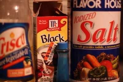 2 tazas de agua con colorante negro y azul (se necesita la gran botella de colorante negro para el color profundo) 1 cucharada de aceite 1 cucharada de Crémor Tártaro 1 taza de sal de cocina