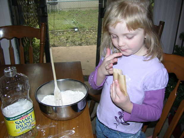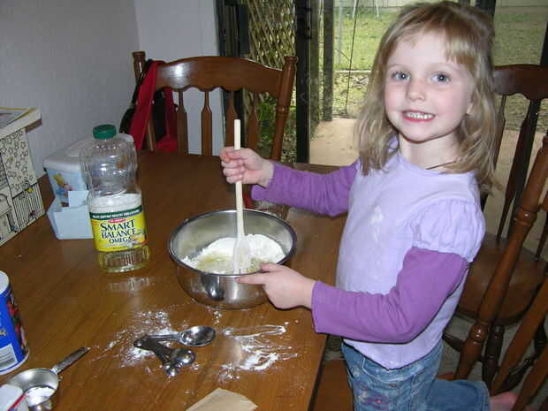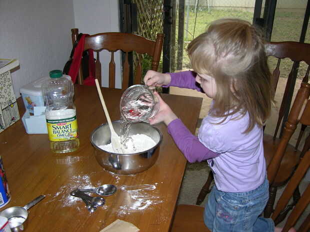 La señorita de la foto tiene casi cinco años y es capaz de hacer más de esto con solamente la mínima ayuda. No pudimos montar nuestra cucharada en el envase de crema de Tártaro, así que llené la cuchara para que la descarga, y derramé el aceite - que es un lío que no quieres tener que limpiar, siempre!