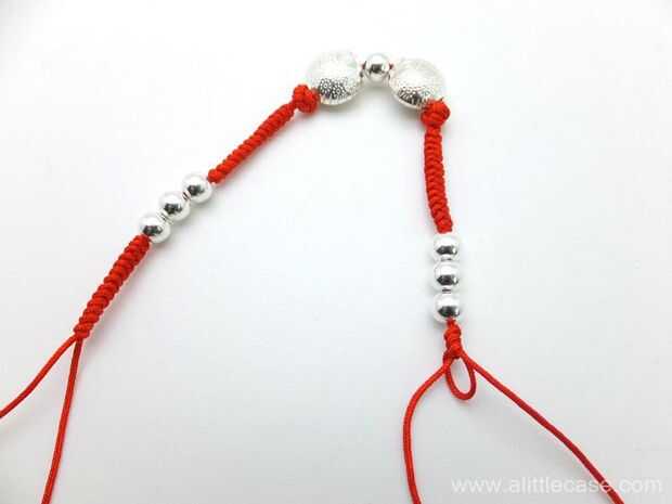 Comparar la izquierda a la derecha, mantener igual longitud, y añadir tres granos y trenza de nudos de serpiente. Después de ambos lados con longitudes del mismo, añadir tres granos. Luego continuar trenzado con nudo de serpiente.