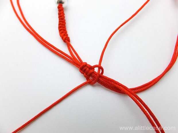 Parada trenzado cuando alcance la longitud deseada. Un nudo plano para garantizar su trenza con otra cuerda roja. Haga clic aquí para ver las instrucciones de nudo plano.