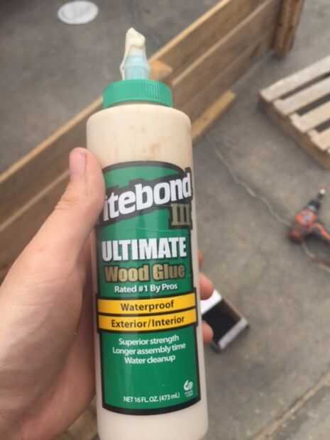 Pegar las patas al asiento. Pongo el pegamento en la parte superior de las piernas y en el lado de la viga de apoyo en la plataforma. Antes de presionar las dos piezas de madera juntos he dejado el pegamento llegue a ser pegajosa. Dejar que la cura de pegamento, permite que la madera a pegar mejor juntos. Más tarde esto hace más fácil atornillar las tablas.