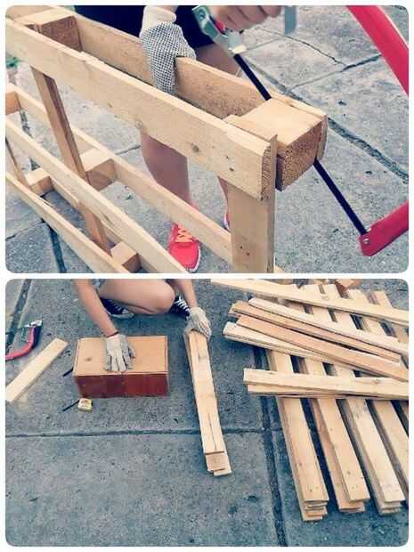 Versión A: ayuda de martillo y cincel quite lo clavos oxidados o versión B: uso plancha VI - más rápido, pero los clavos oxidados permanecen en la madera después de elegir 8 pedazos de listón de 80cm (31,5 en). Entonces, usted necesita 40 piezas de 40 cm (15,7 en) y 2 piezas de listón de 33cm (13 pulgadas). Puede ver los listones del largo - 120cm - en tercera y los otros listones de 80cm en la mitad.
