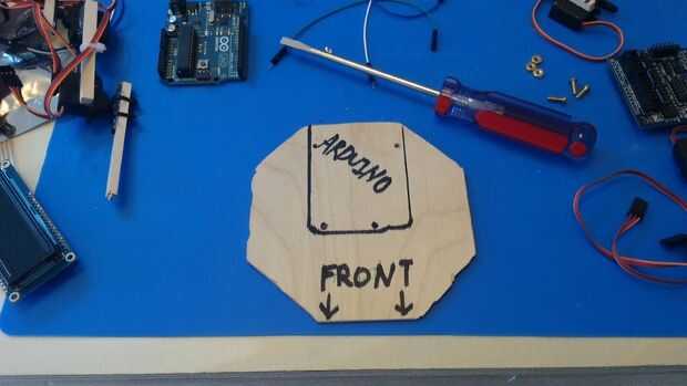 Primero elige qué forma y tamaño que desee su robot que. Desea dejar espacio suficiente para el Arduino, batería y siempre deja espacio para pi. También se necesita montar las patas al cuerpo. Les montara en la parte inferior para guardar toda la habitación en la parte superior de la electrónica. antes de cortar el cuerpo marcar donde quieres poner todo. Taladre los agujeros para el Arduino y la batería y luego cortar el cuerpo.