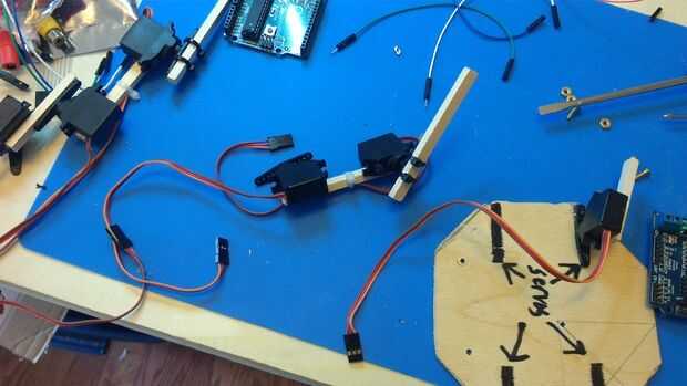 ---trabajo en progreso---Se trata de un robot cuadrúpedo en prototipos con seeeduino mega, 12 HXT900 hobby micro servos, 3.7V batería de lipo. Materiales utilizados son madera contrachapada todo asegurada con tuercas y los pernos pequeños. Programado