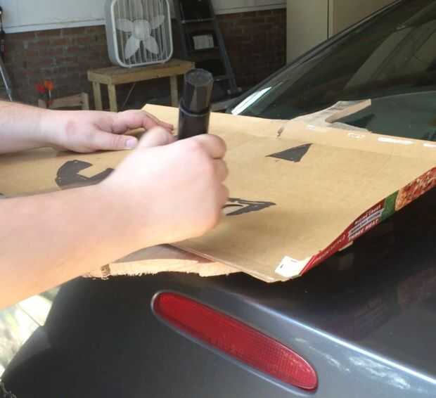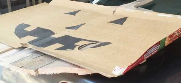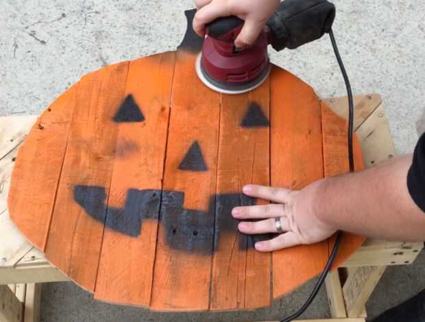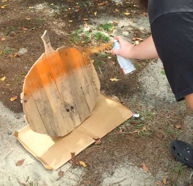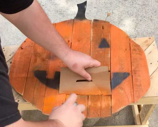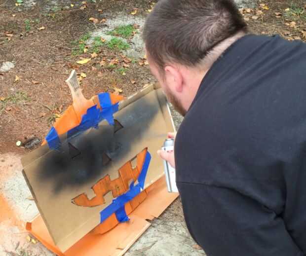 Usando un aplanado hacia fuera de la caja de la pizza, había creado una plantilla para mi cara de Jack-o-lantern. Una vez satisfecho, usé una cuchilla Xacto para cortar el diseño. Puse por 2 capas de pintura en aerosol naranja, dejando que cada seco según las instrucciones. Quería la cobertura, pero no era necesario el grano a desaparecer completamente. Después de esto estaba lo suficientemente seco como para manejar, usé cinta de pintor para conseguir la plantilla y negro rociado a través de los ojos, nariz, boca y vástago.