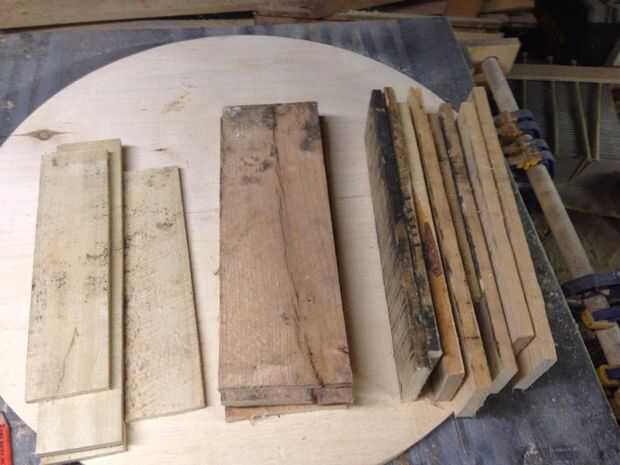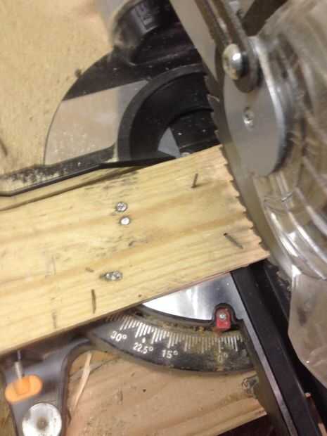 Si tus tablones superior todo hack solo las piezas de clavo apagado en el inglete vio, no queremos clavo agujeros en las piezas de todos modos, también hacer un áspero de su madera aquí también. Lo que buscas es pedazos que son sólidos, sin los enormes nudos en ellas, o se agrieta, y quiere un lado semi recto. Así que después de que hayas tomado acción de sus piezas y corte el clavo agujeros hacia fuera, verifique y asegúrese de que usted todavía tiene un montón de madera para cubrir la mesa. Recuerde que más es mejor puede siempre tirar esta basura que no uso, o usarlo de posavasos, o lo que desea tu corazón hippy.