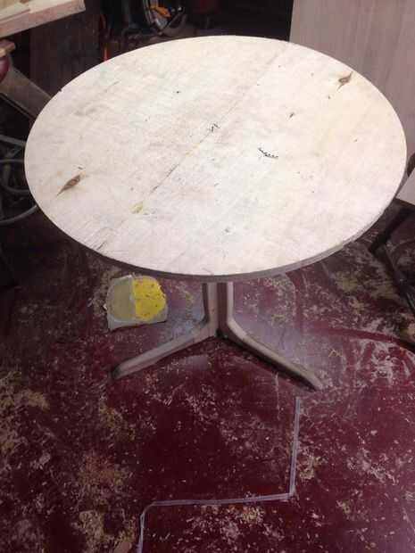 Una vez que todo se corta hacia fuera y seco y de las abrazaderas, tome un momento y pegar un clavo en el punto central de la mesa, inserte ese clavo en el agujero perforado en las piernas, aléjese y admirar su mitad terminado obra.