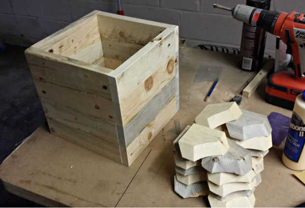 Empezar con los bloques de la esquina y pegar las partes posterioras de ellos antes de colocar en las esquinas. Asegúrese de alinear el interior de los bordes inglete aristas de la caja (ver foto). Agregar unos clavos del clavito de od a mantener en su lugar mientras el pegamento seca. Continúe alrededor de la caja y pegado de los bloques a la caja y de los demás. Añadir broches en las esquinas para colocar dos juntos.