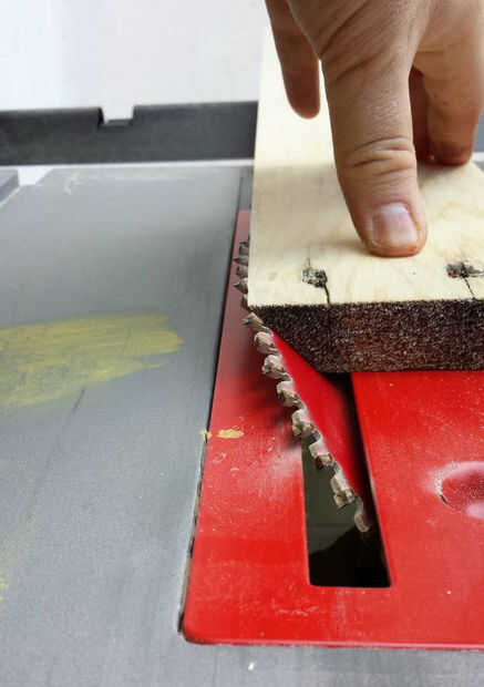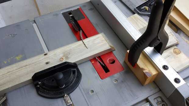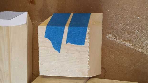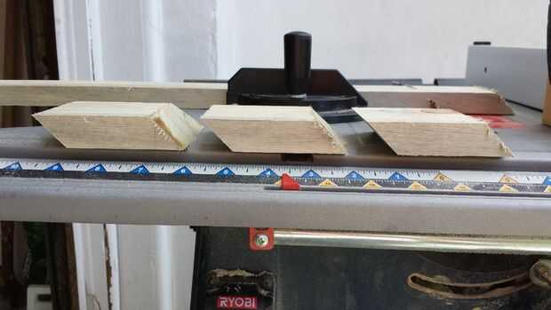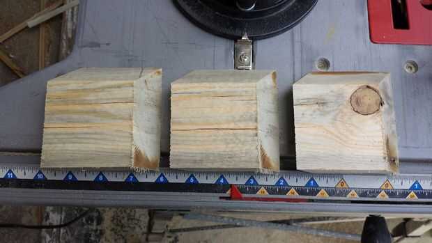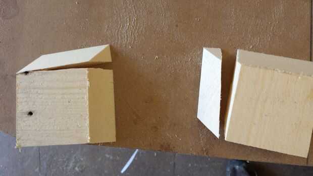 Con dos de las tablas de 3/4" de espesor, corte hasta 3 1/2" ancho. Un borde es cortarse con un bisel de 45 grados. Entonces usando el trineo de ingletes o una ingletadora sierra con el bisel a 45 grados, cortar 3 1/2" largo.