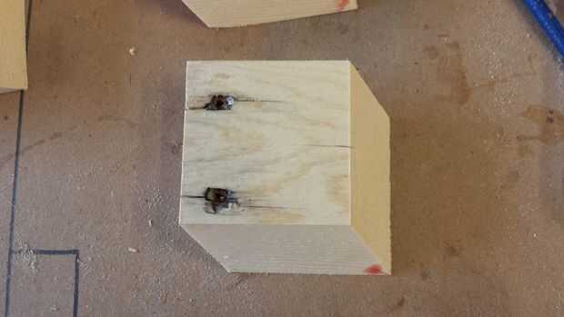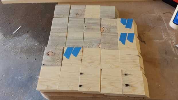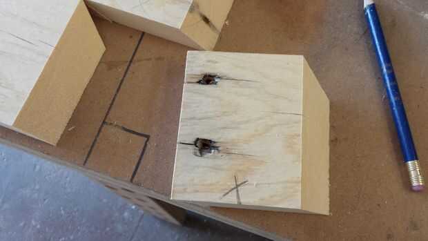 Con las piezas de bloque de esquina colocadas sobre una superficie de trabajo, asegúrese de que el lado que muestra un único bisel quede hacia arriba y a la derecha. Marcar el borde inferior con una X. Este es el borde que se corta a continuación con otro bisel.