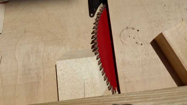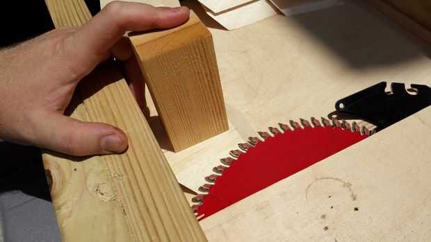 En el trineo de inglete, alinee el borde de la pieza con el corte en inglete trineo con la X. Asegúrese de utilizar un trozo de madera para sujetar la pieza en su lugar para mantener sus dedos lejos de la hoja ya que estas son pequeñas piezas.